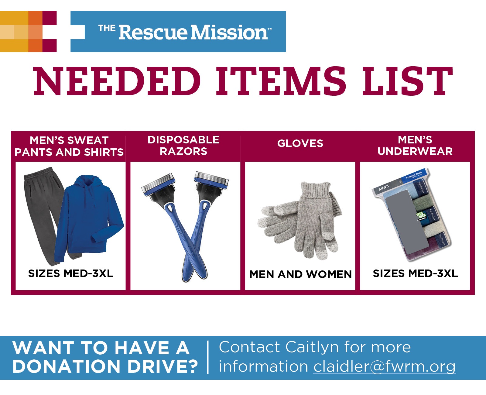 We've come up with our most-needed items and divided them up into months. Each month we're collecting specific items to grow our inventory to better serve homeless men, women, and children.